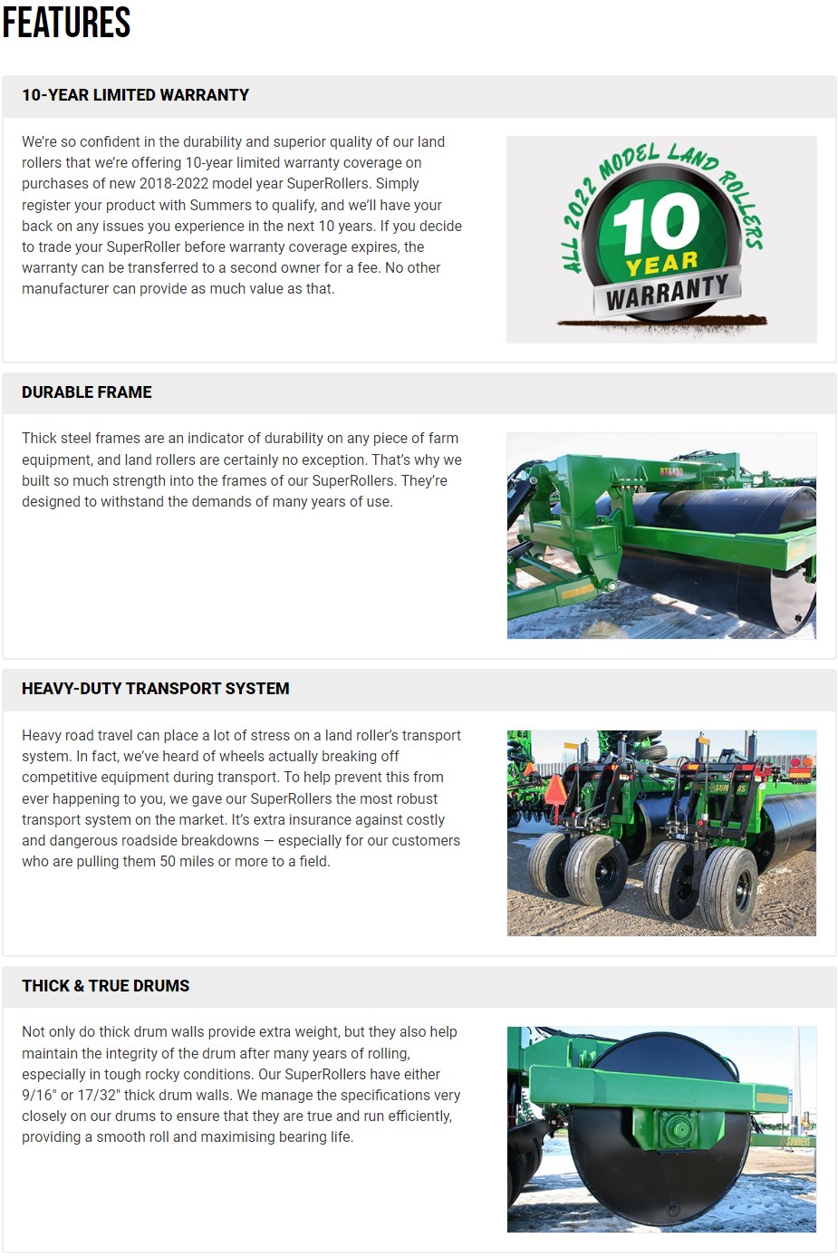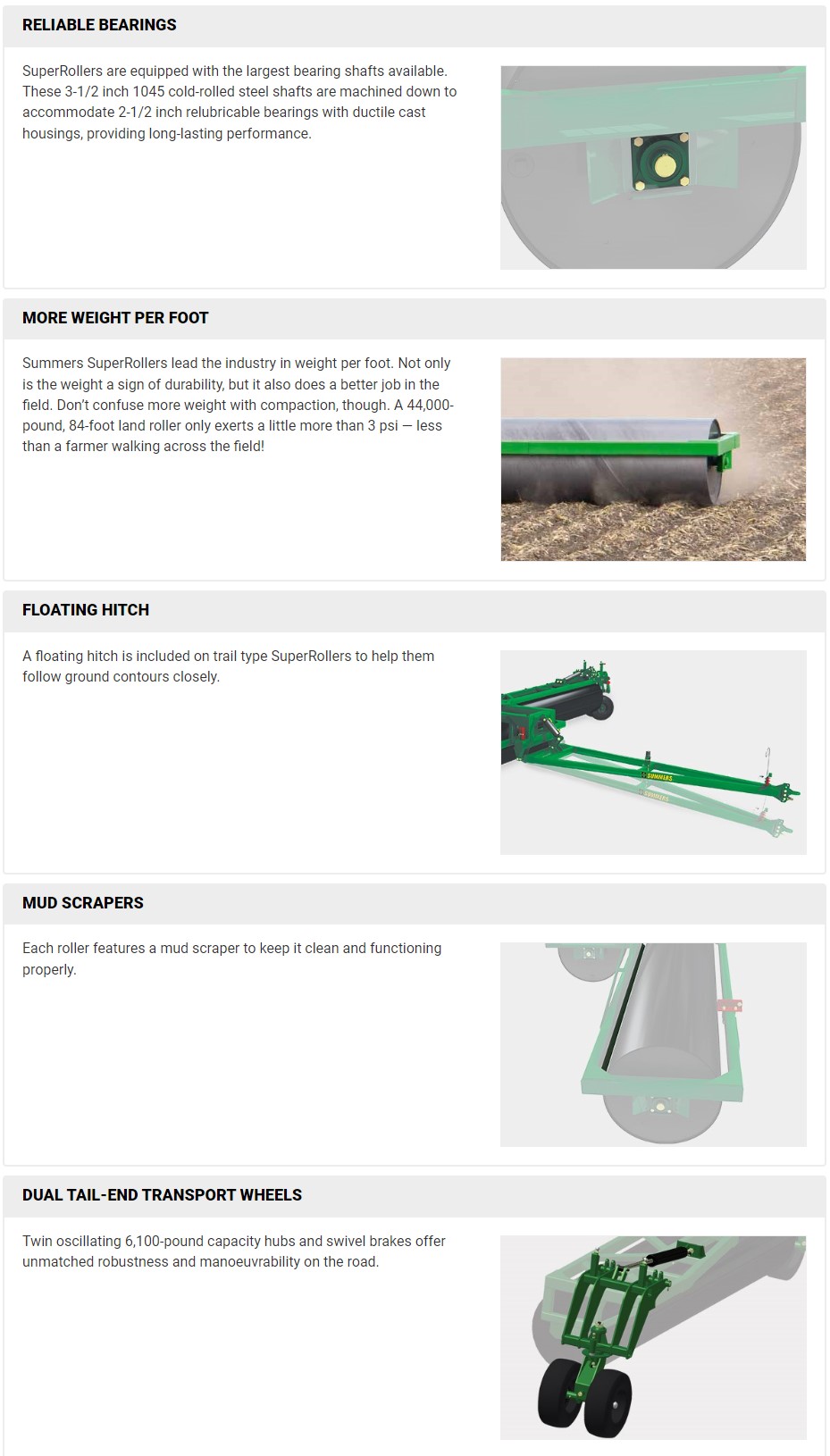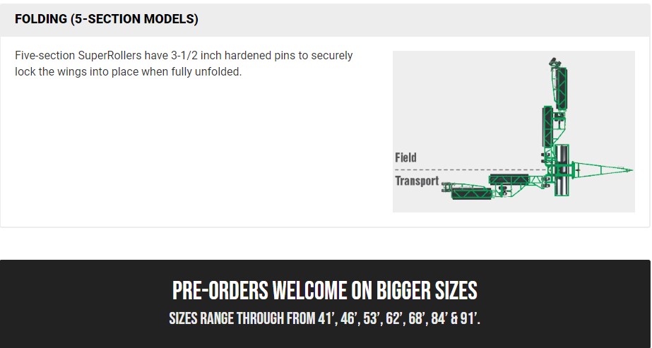 Trail type SuperRollers are a top choice for heavy duty land rolling applications. RT Series rollers require the operator to drive in reverse a short distance to unfold the units into field position. However, three-section models have a unique auto-fold system with steerable wheels, while five-section rollers use an unfolding assist arm to make this process quick and easy. These models have 3-1/2-inch hardened pins to securely lock the wings, robust oscillating dual wheels for enhanced road travel.