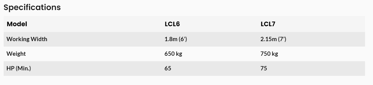 The LCL comes standard with a 75 Hp gearbox and can be optioned up with a 100 Hp gearbox. The LCL Series has a heavy duty 5mm galvanised deck construction, heavy duty floating A-frame, friction clutch, adjustable side shoot, two front adjustable rollers and a single adjustable tail wheel.