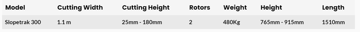 The Twose SlopeTrak 300 has low ground pressure creating minimal surface disturbance during operation. The low centre of gravity and wide track widths offer maximum stability and optimum handling whilst working on slopes up to 55°.